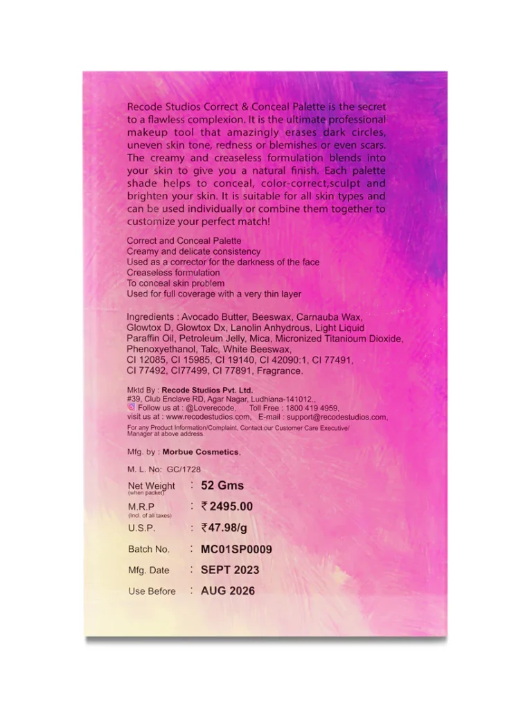 Recode Studios Correct & Conceal Palette is the secret to a flawless complexion. It is the ultimate professional makeup tool that amazingly erases dark circles, uneven skin tone, redness or blemishes, or even scars. The creamy and creaseless formulation blends into your skin to give you a natural finish.